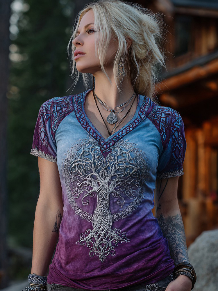 Vintage Viking Celtic Knot Embroidered Gradient Art Raglan Sleeves T-shirt
