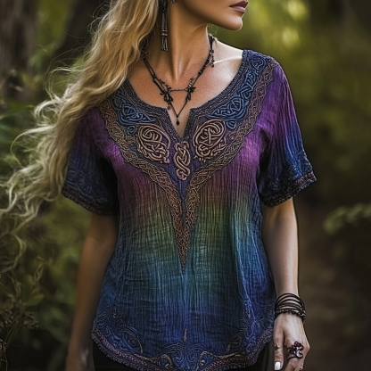Vintage Viking Celtic Knot Embroidery Gradient Art Linen Shirt