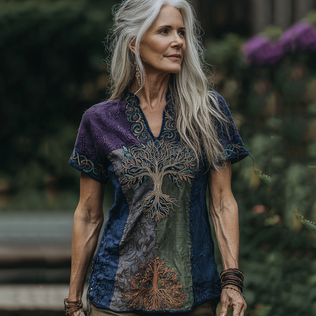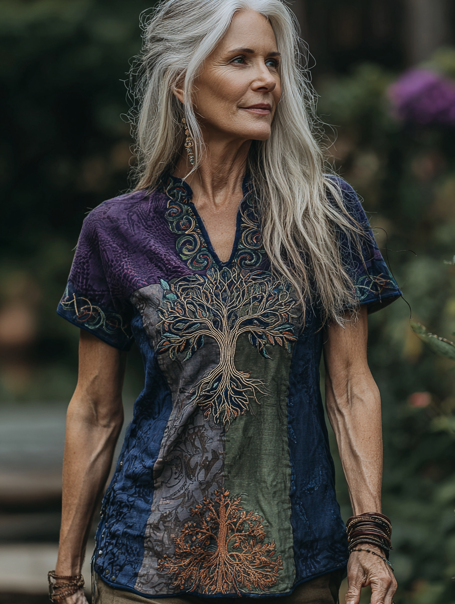 Vintage Viking Celtic Tree Of Life Patchwork Linen Shirt