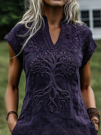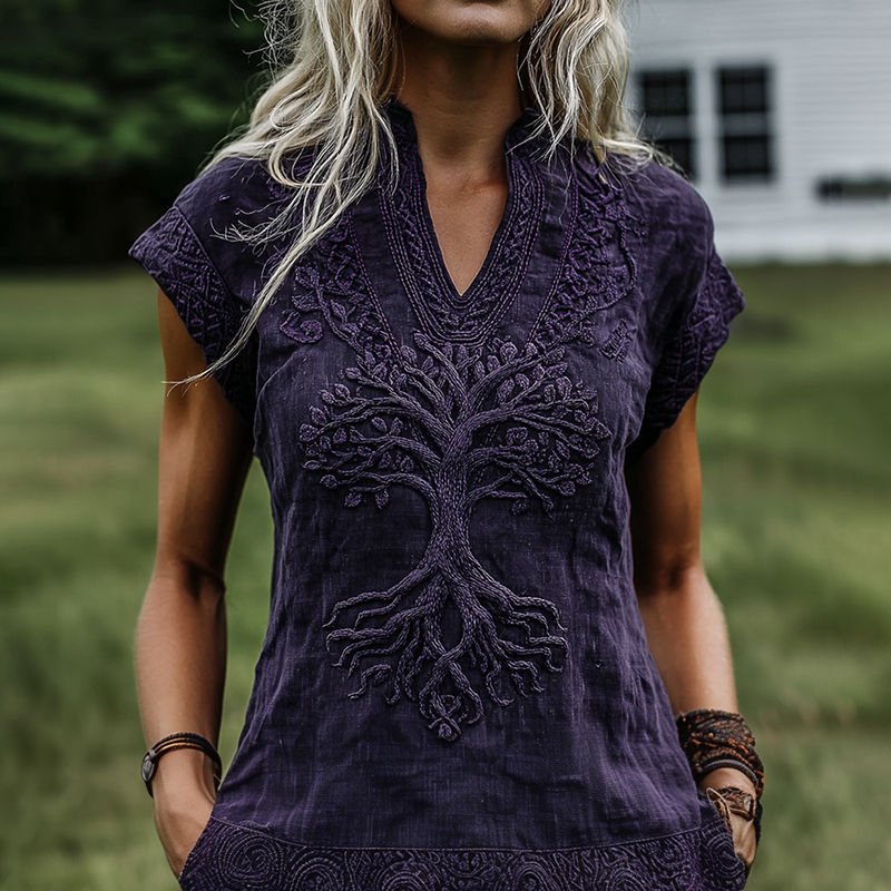 Vintage Viking Life Of Tree Celtic Embroidered Linen Blend Shirt