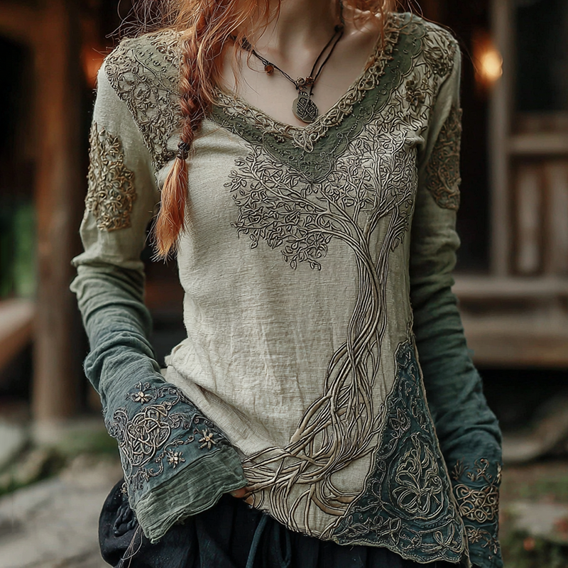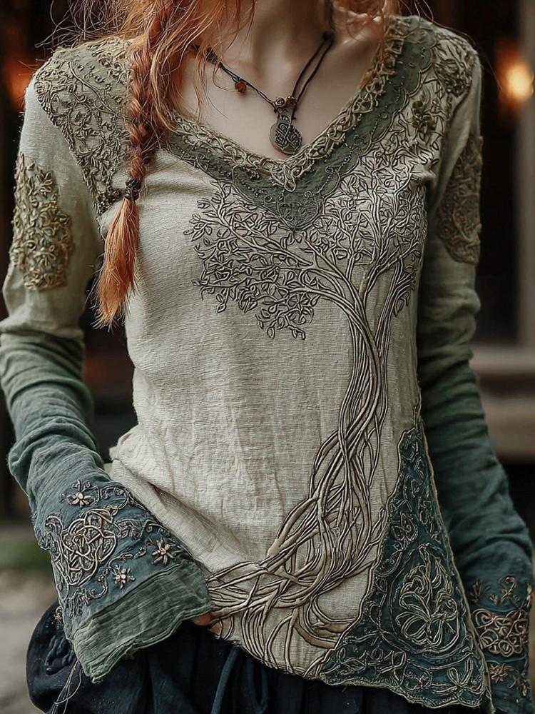 Vintage Viking Tree Of Life Gradient Art V-neck Long Sleeve T-shirt