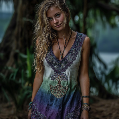 Vintage Viking Tree Of Life Gradient Print V-neck Tank Midi Dress