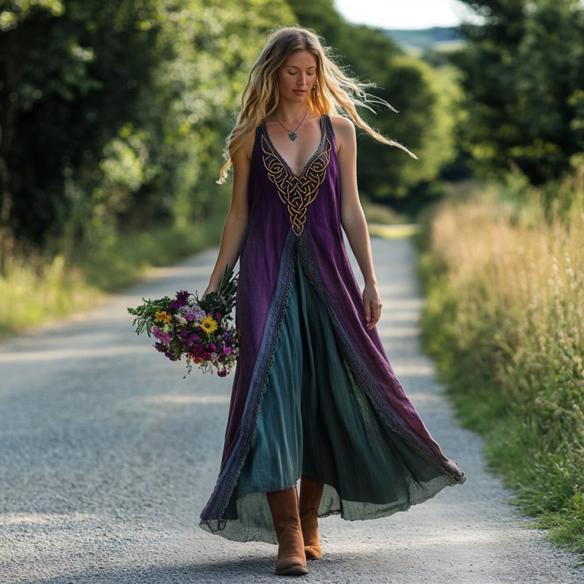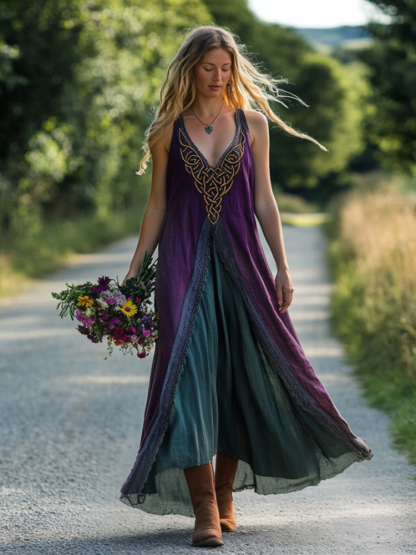 Vintage Viking Tribal Celtic Knot Embroidery Gradient Art Linen Tank Dress