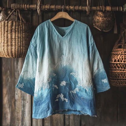 Vintage Waves Inspired Embroidery Japanese Art Linen Blend Cozy Tunic