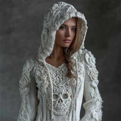 Vintage White Roses Viking Celtic Skull Hooded Cozy Knit Sweater