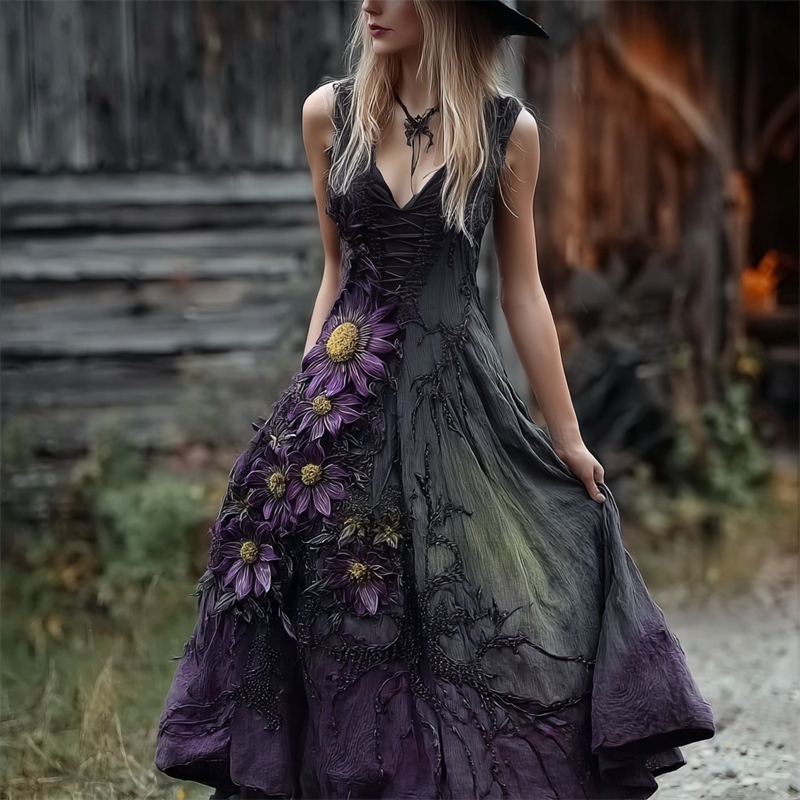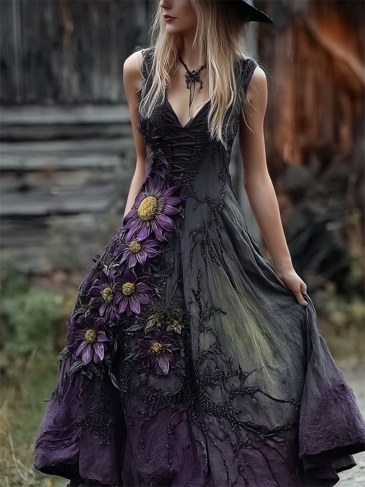 Vintage Witch Purple Flowers Dyed Linen Maxi Dress