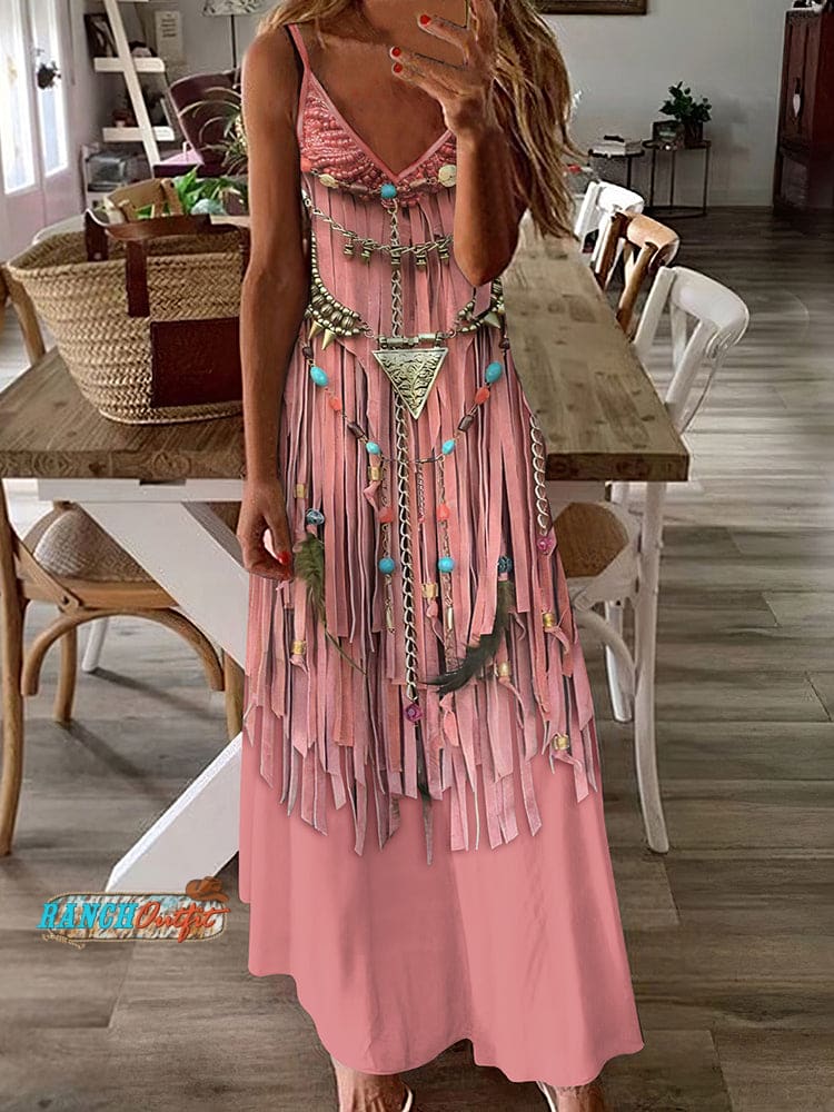 Western Tassel Printed V-Neck Suspender Maxi Dress