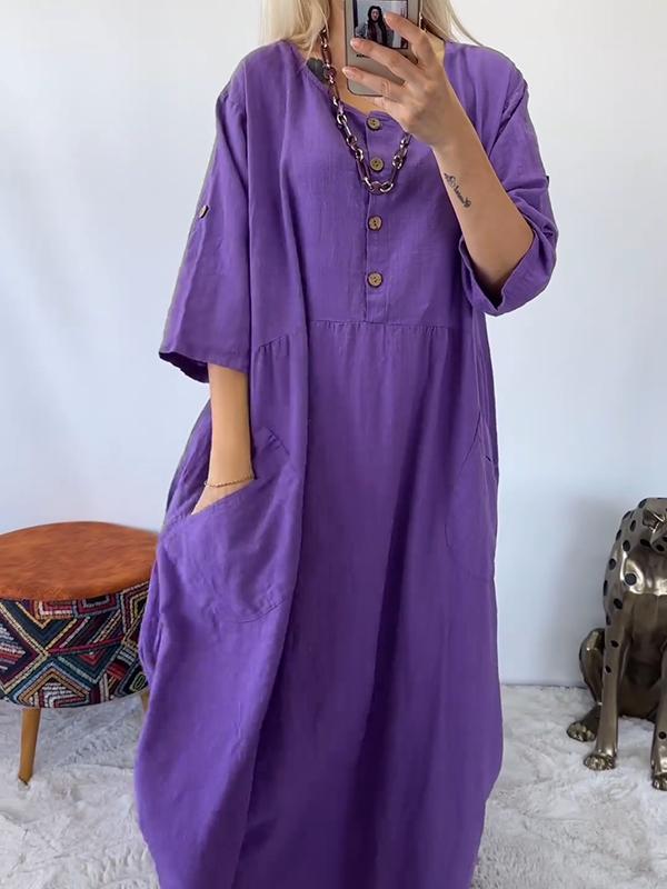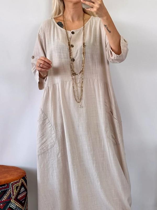 Women Casual Plain Buttoned Crew Neck Dress