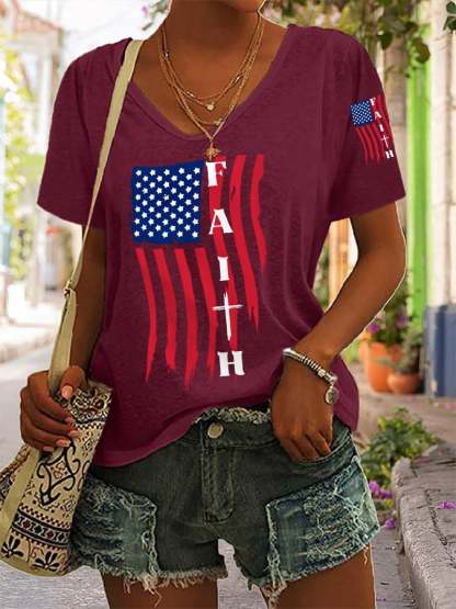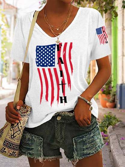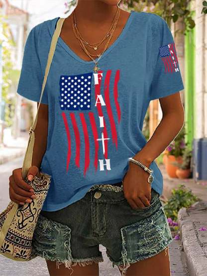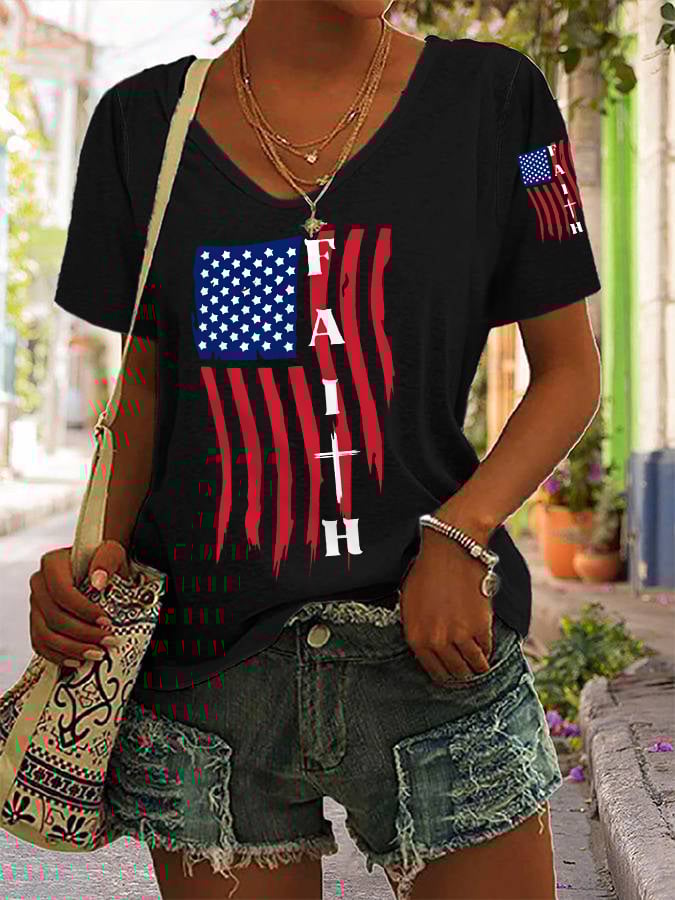 Women's America Flag Cross Faith Casual V-Neck Tee