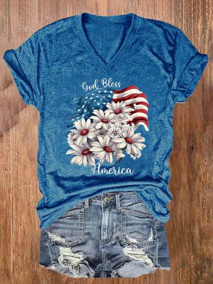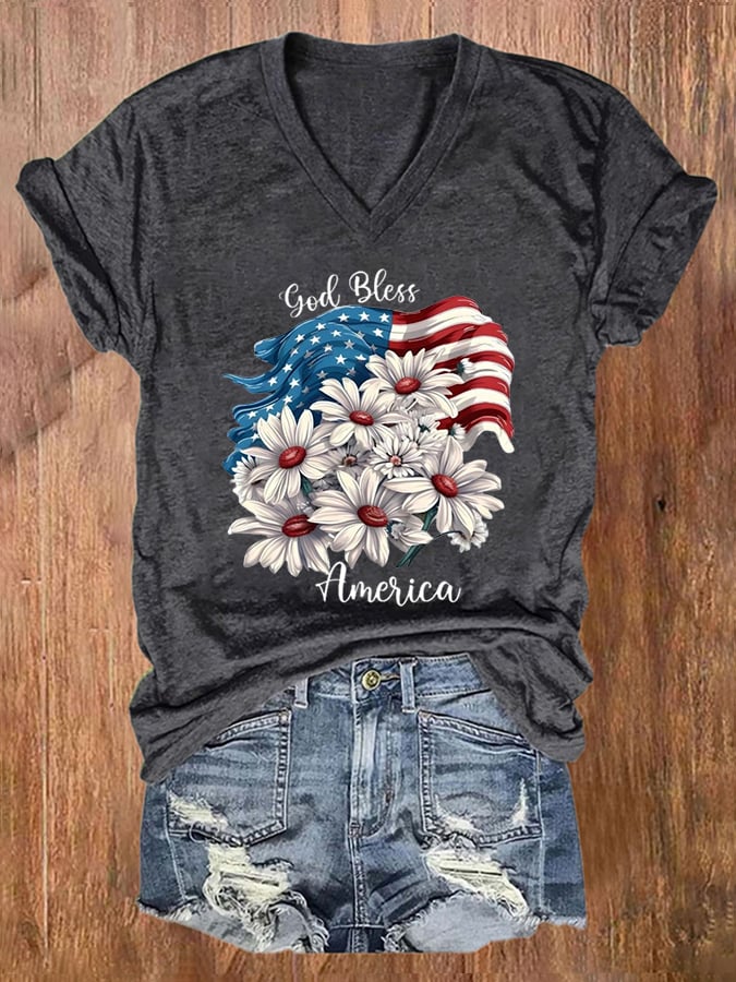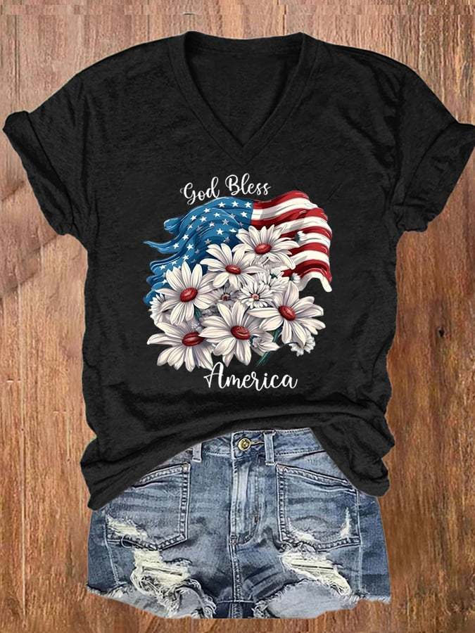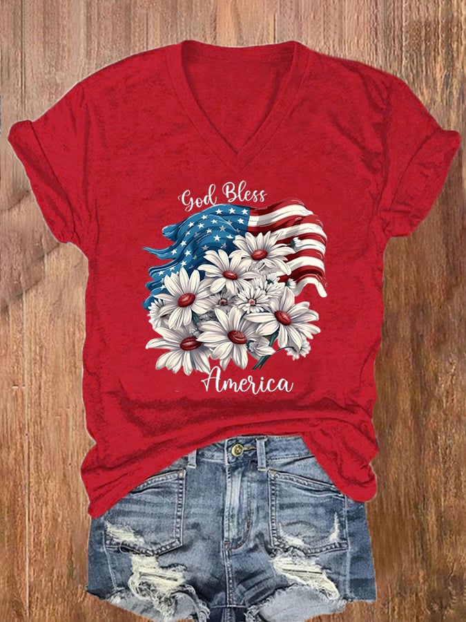 Women's American Flag Independence Day Print V-Neck T-Shirt