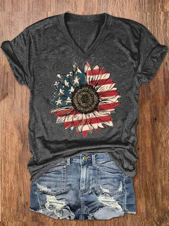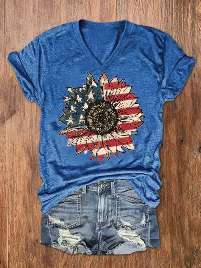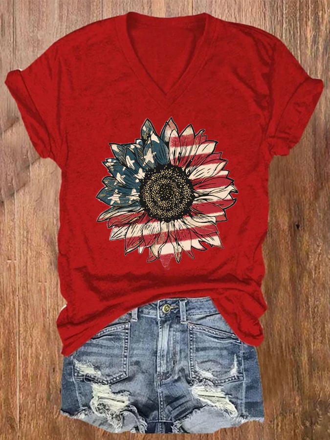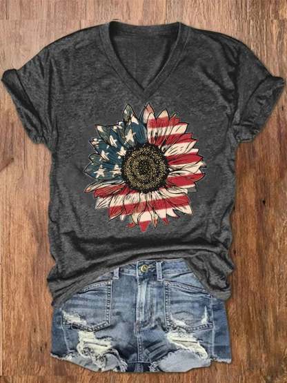 Women's American Flag Independence Day Print V-Neck T-Shirt