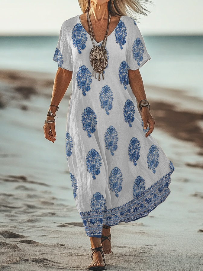 Women's Art Floral Painting Hippie Retro Print V-Neck Short Sleeve Dress