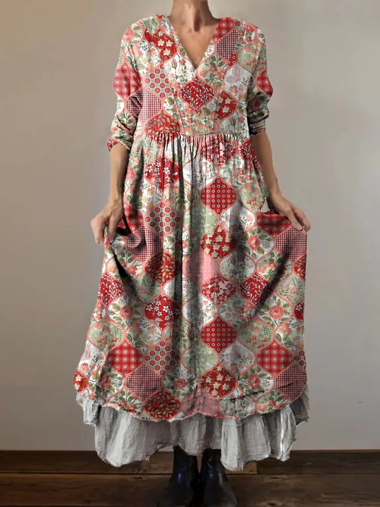 Women's Bohemian Floral Collage Art Pattern Print V-Neck Pocket Cotton Dress