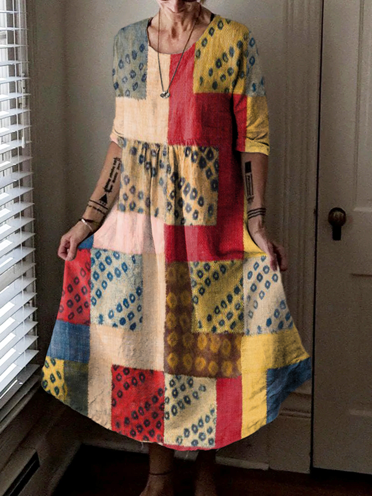 Women's Bohemian Vintage Collage Art Print Long Sleeve Pocket Cotton Dress