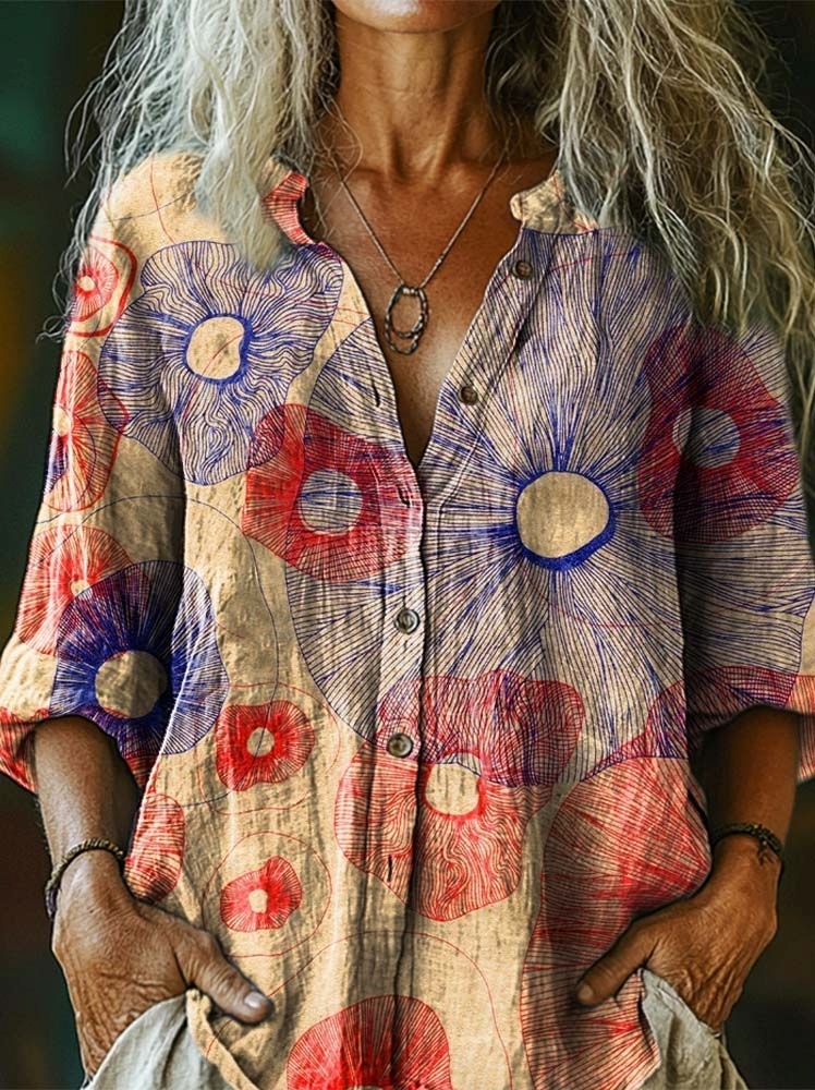 Women's Bohemian Vintage Floral Art Print Casual Cotton Linen Shirt