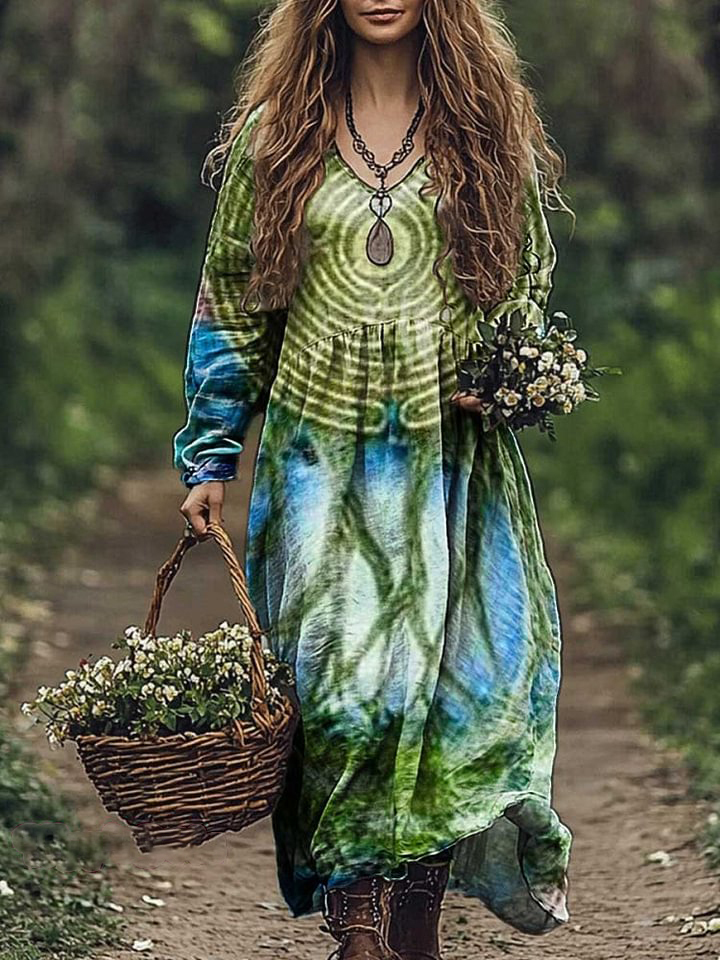 Women's Botanical Circle Art Print Pocket Cotton Dress