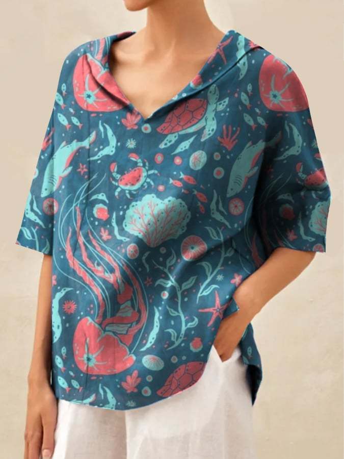 Women'S Botanical Floral Print Pattern Casual Linen V-Neck Shirt