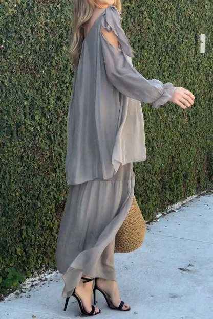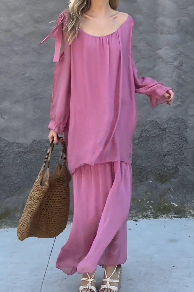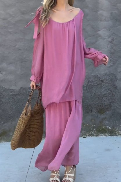 Women's Casual Arm Hollow Tie Top and Skirt Suit