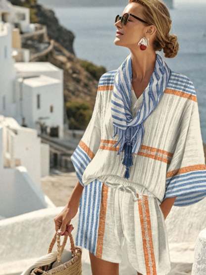 Women'S Casual Cotton And Linen Holiday Striped Loose Suit