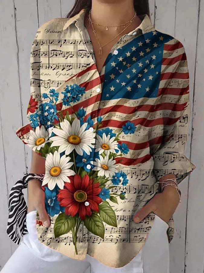 Women's Casual Cotton And Linen Oil Painting Independence Day Shirt