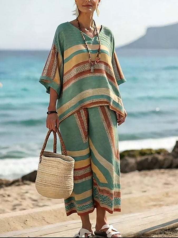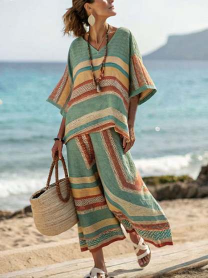 Women's Casual V Neck Striped Printed Trousers Two-Piece Set