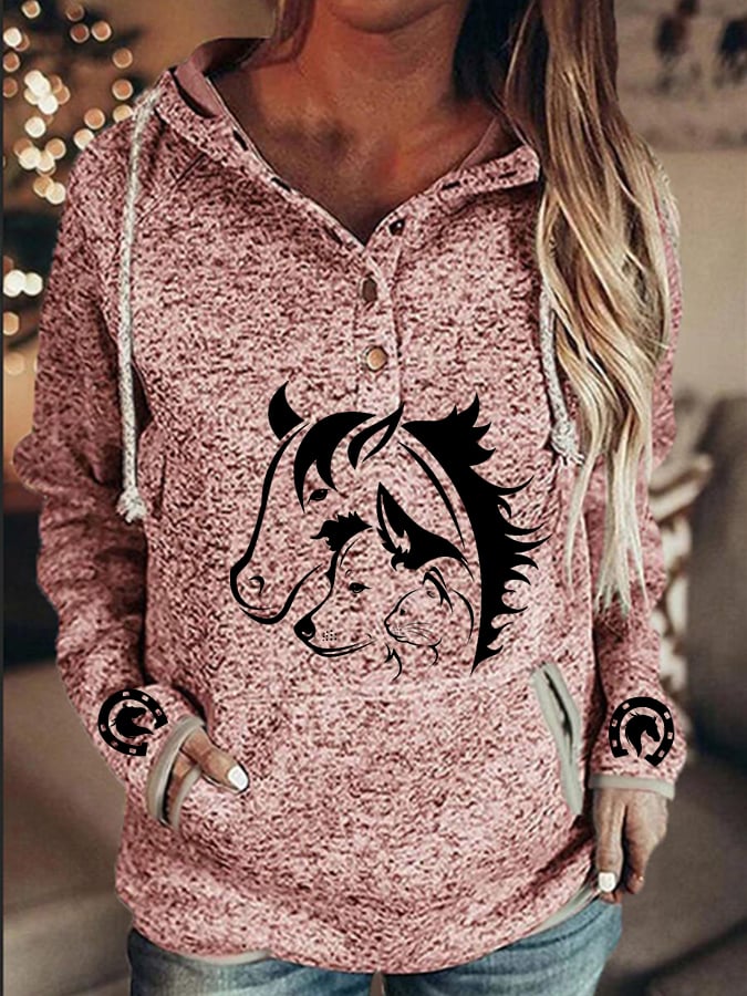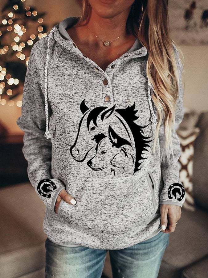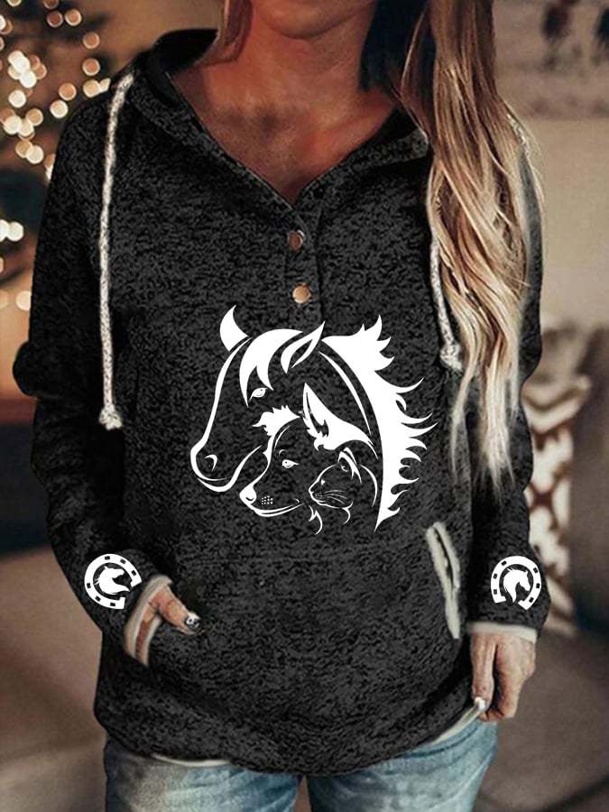Women's Cat Dog Horse Silhouette Print Casual Pocket Hooded Sweatshirt
