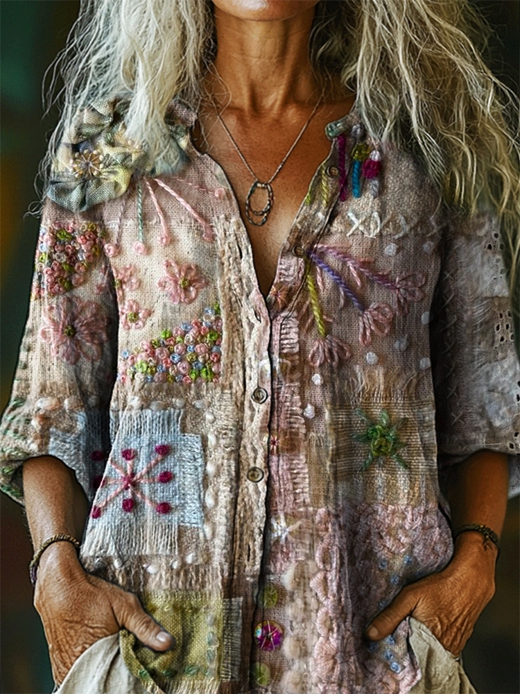 Women's Collage Floral Tattoo Pattern Art Print Casual Cotton Linen Shirt