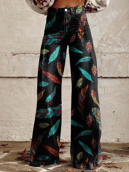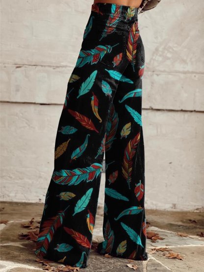 Women's Color Feather Black Bottom Print Casual Wide Leg Pants