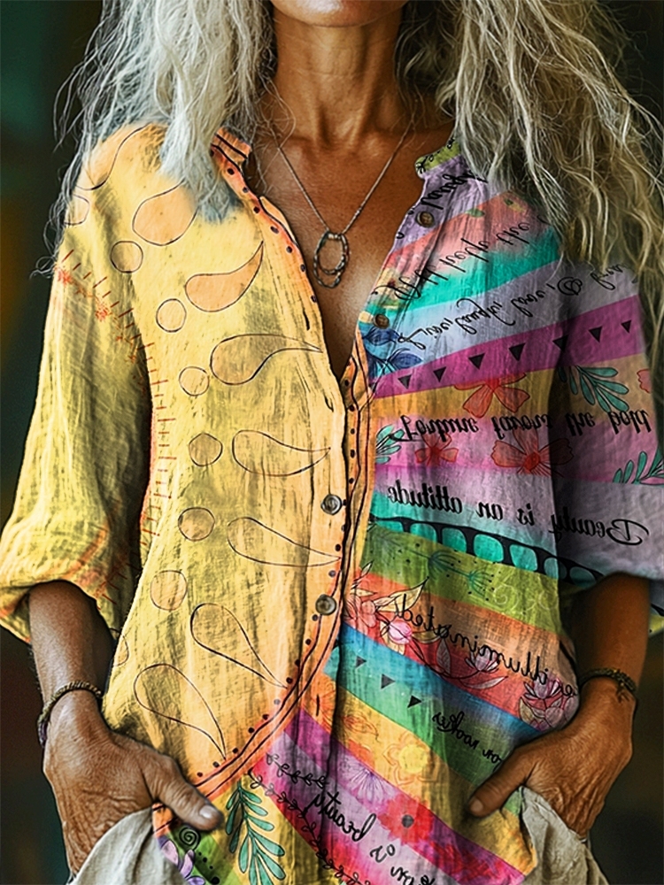 Women's Colorful Colorblocking Sun Pattern Art Print Linen Cotton Casual Shirt