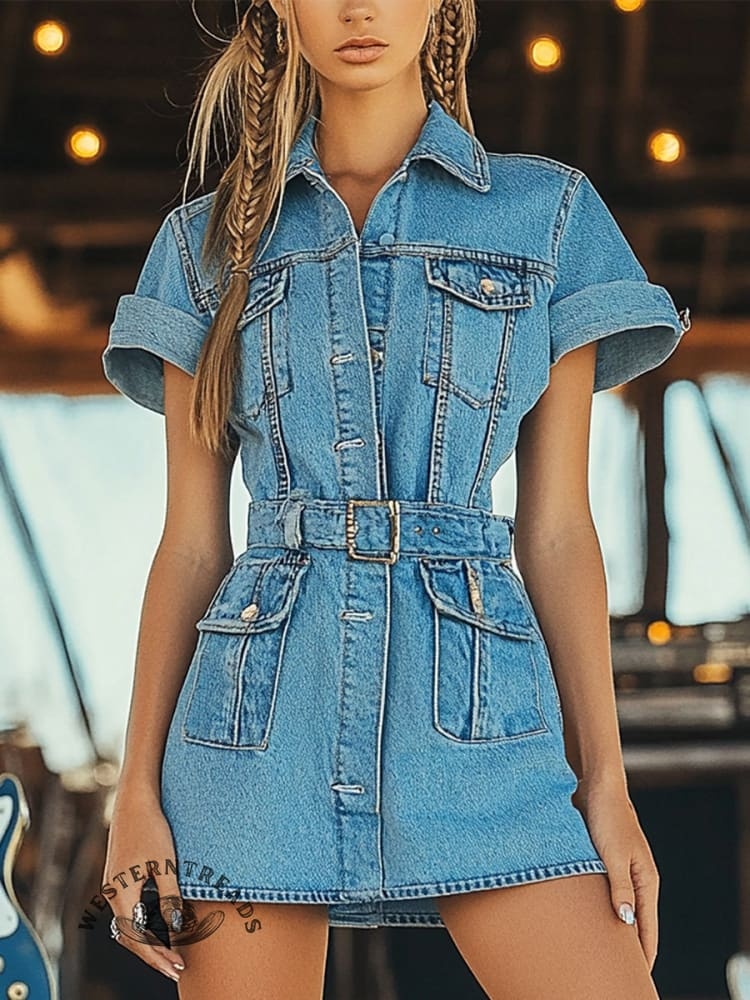 Women's Denim Charm: Stylish Short Dress With Braided Hair