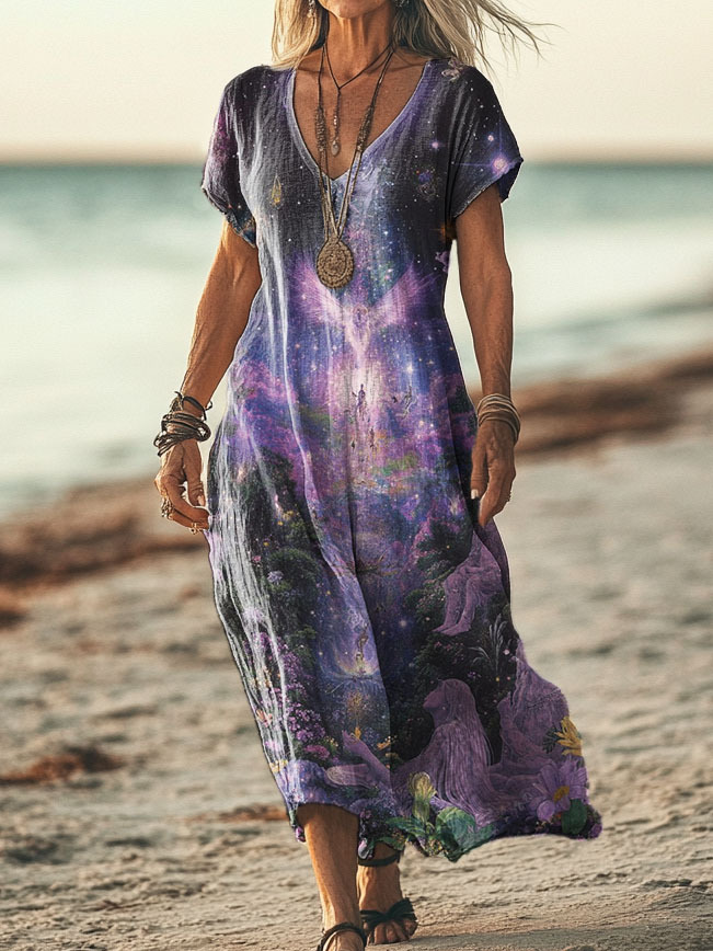 Women's Dreamy Floral Angel Pattern Art Print Short Sleeve Pocket Cotton Linen Dresses
