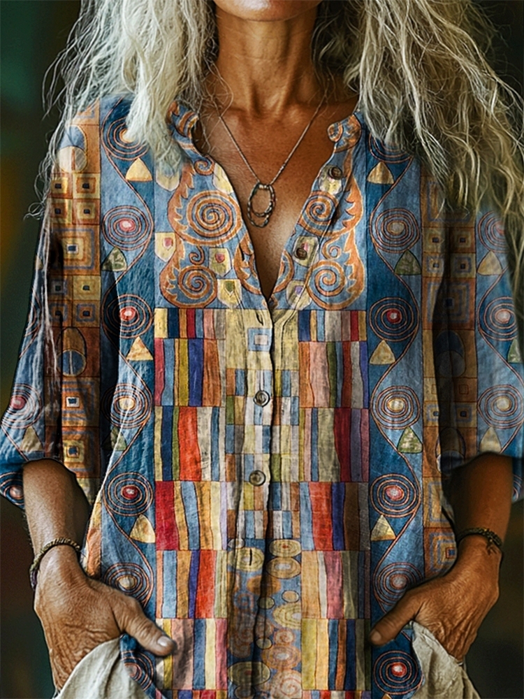Women's Ethnic Irregular Tattoo Pattern Art Print Linen Cotton Casual Shirt