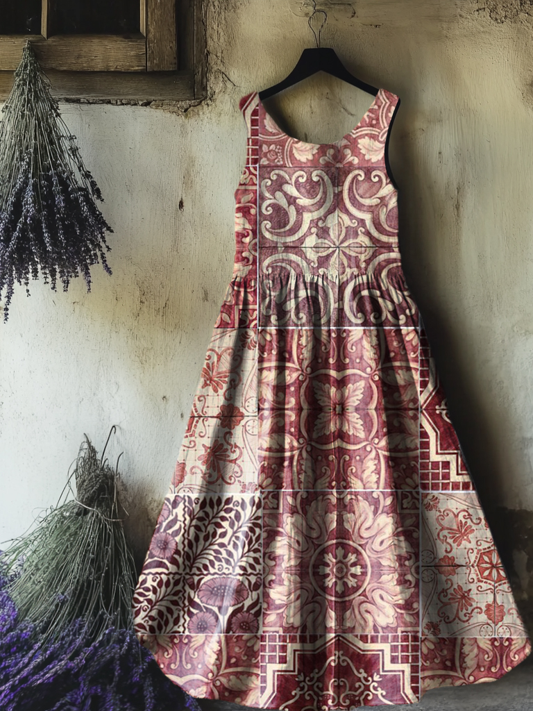 Women's Ethnic Tattoo Pattern Art Print Round Neck Sleeveless Cotton Pocket Dresses