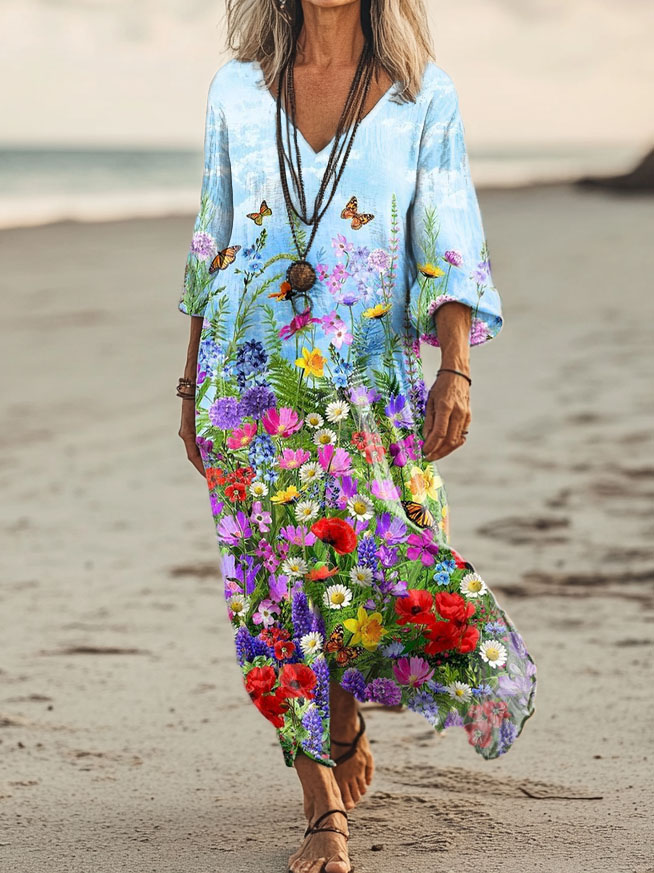 Women's Floral Art Print Pocket Cotton Dresses
