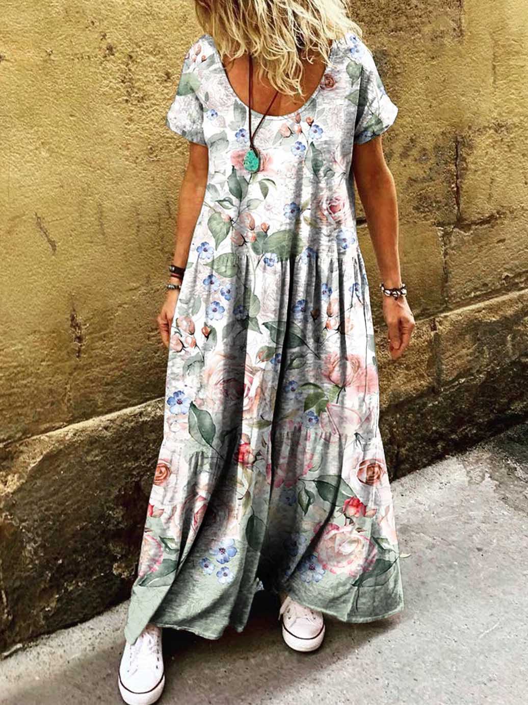 Women's Floral Art Print Pocket Short Sleeve Cotton Dresses
