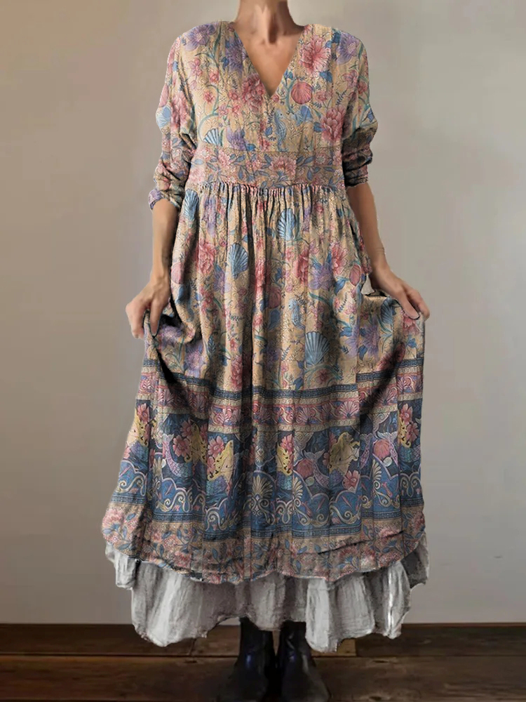 Women's Floral Art Print V-Neck Button Pocket Cotton Dress