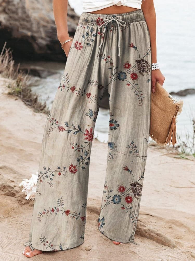 Women's Floral Art Printed Cotton And Linen Casual Pants