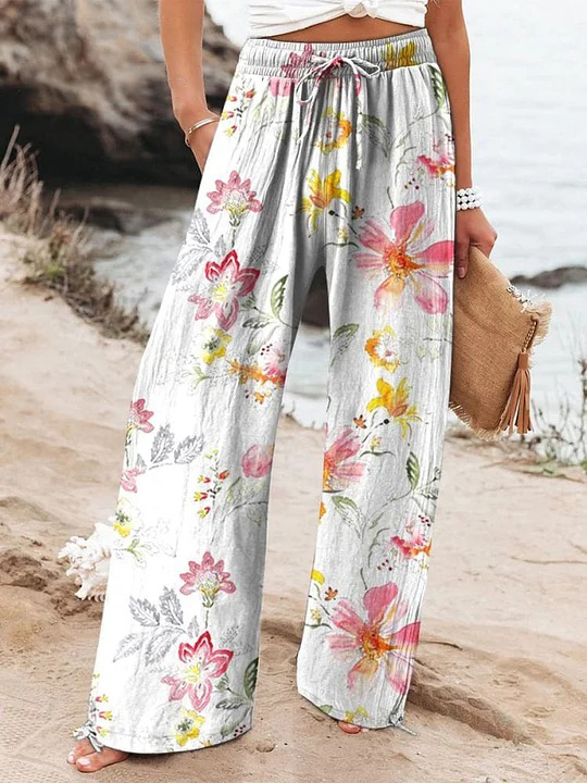 Women's Floral Art Printed Cotton And Linen Casual Pants
