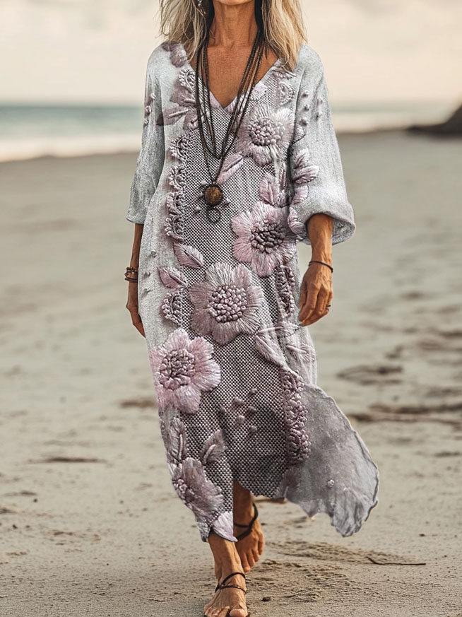 Women's Floral Embellished Pattern Art Print Pocket Cotton Dress