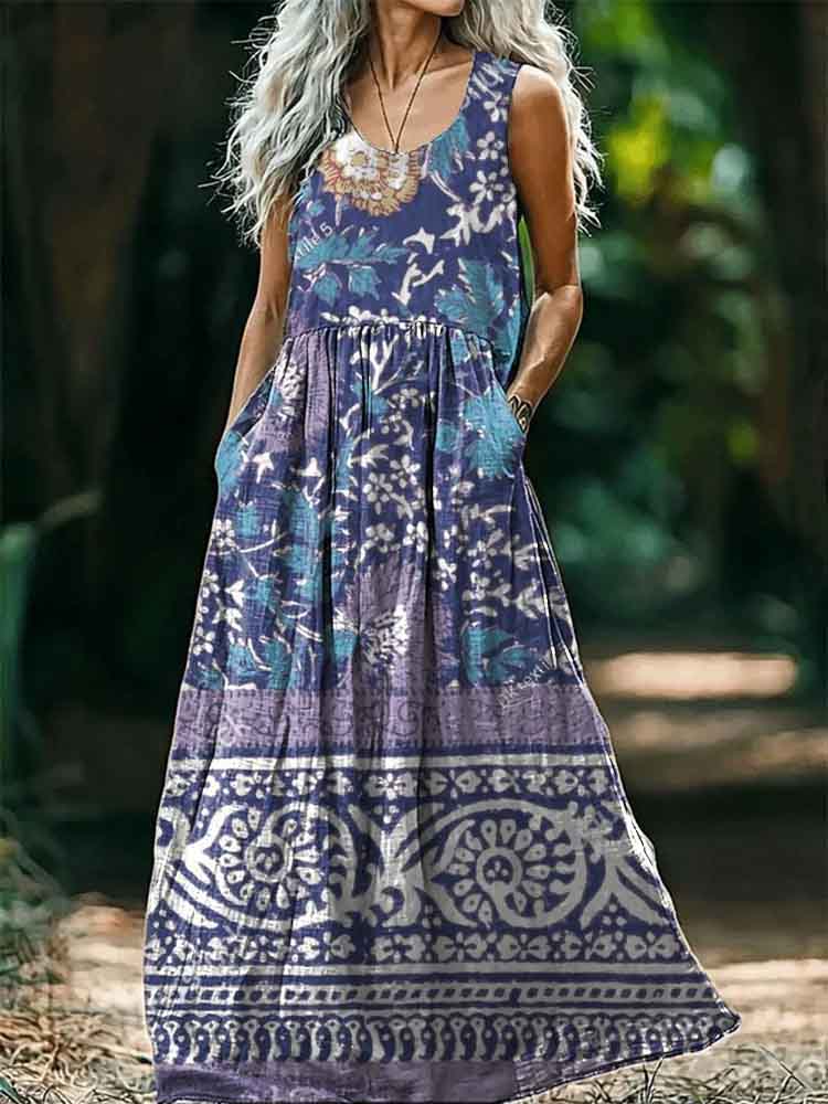 Women's Floral Embellished Pattern Art Print Round Neck Sleeveless Cotton Pocket Dress