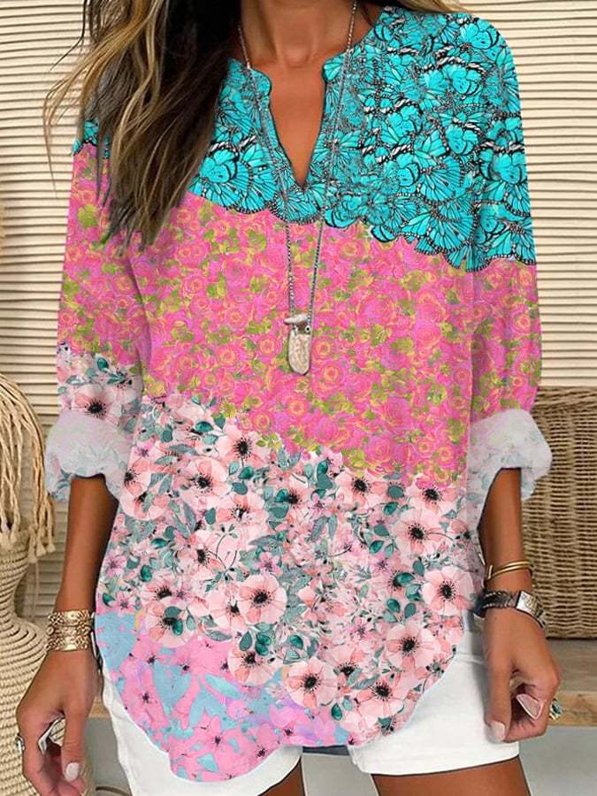 Women's Floral Patchwork Print Casual Long Sleeve V-Neck Shirt