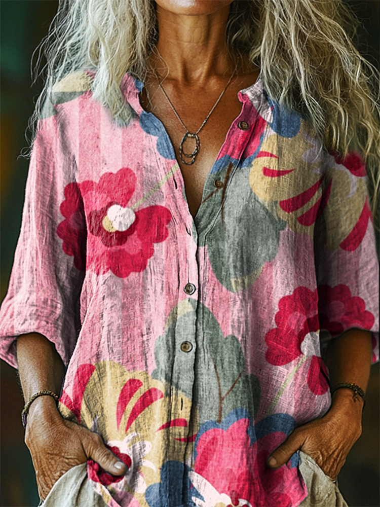Women's Floral Pattern Art Print Linen Cotton Casual Shirt