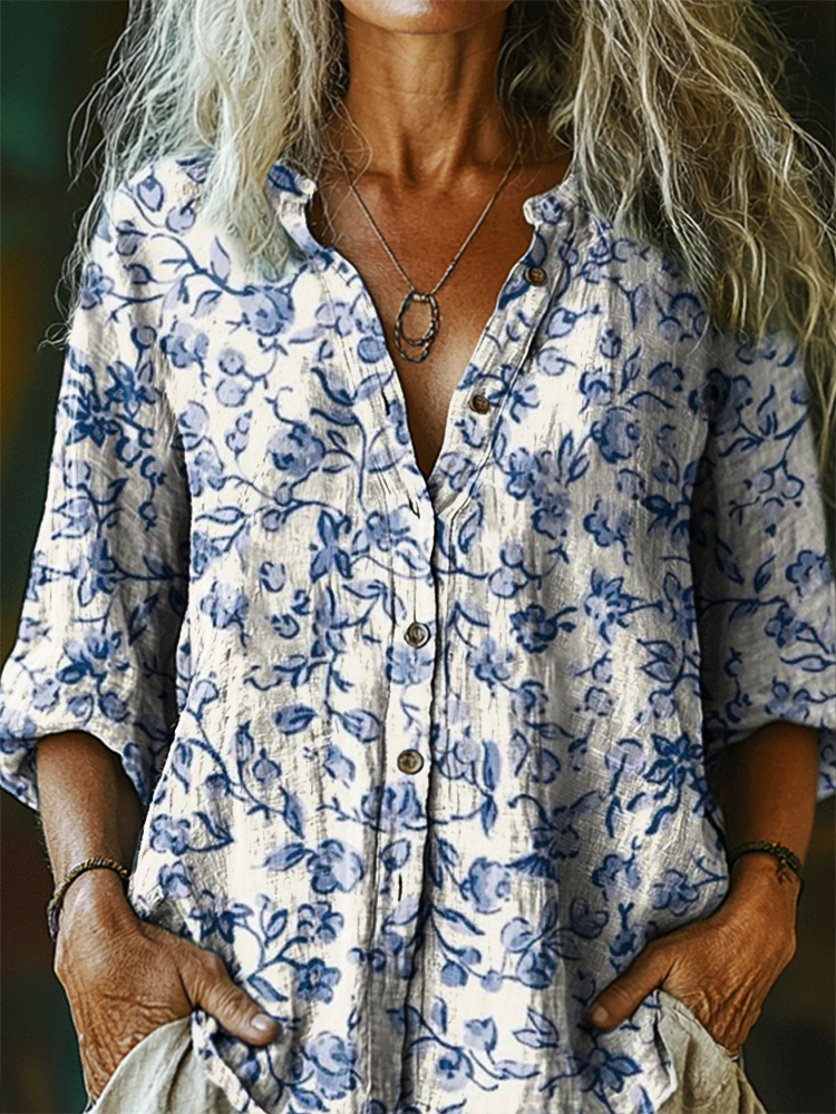 Women's Floral Pattern Art Print Linen Cotton Casual Shirt