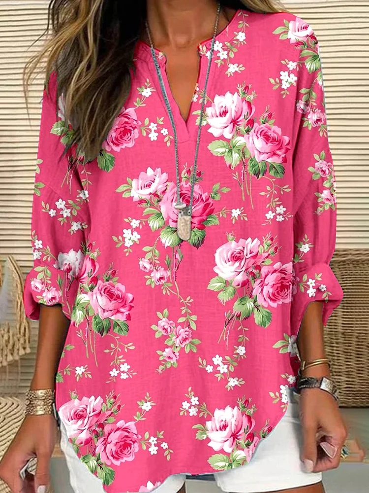 Women's Floral Print V-neck Long Sleeved Linen Blend Shirt