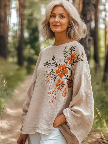 Women's Flower Embroidered Cotton Linen Round Collar Blouse