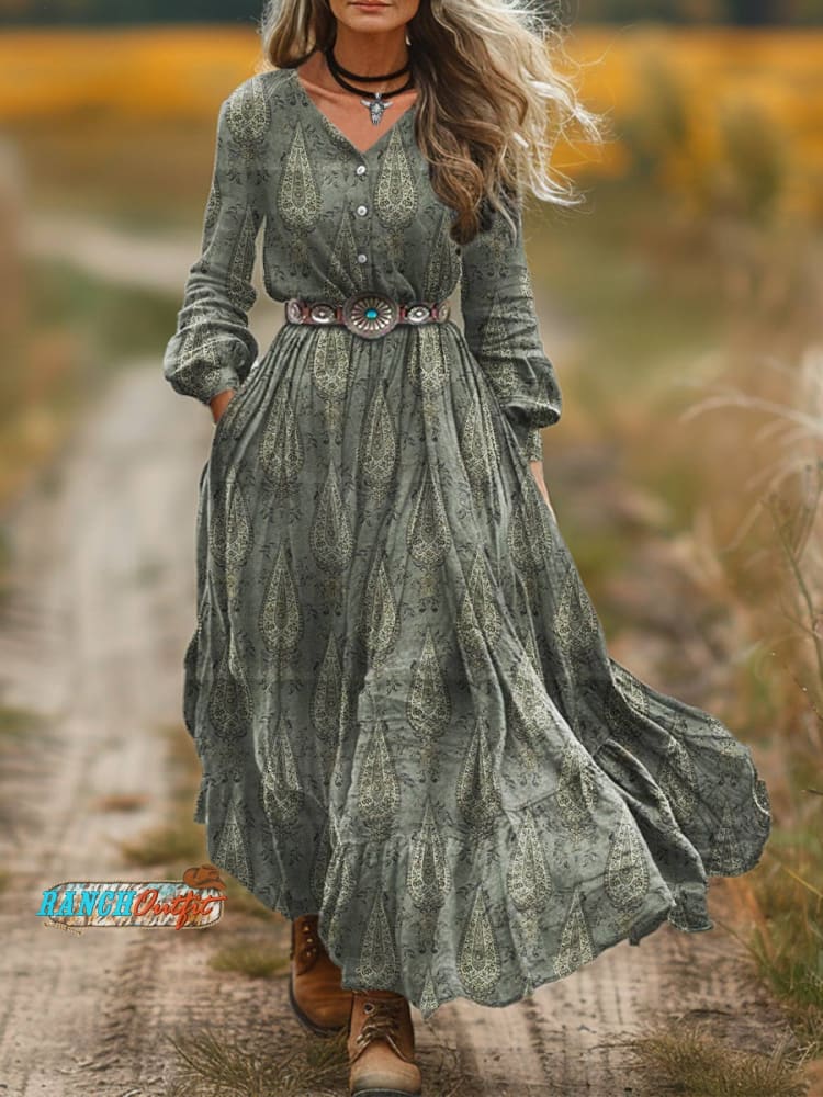 Women's Green Print V-Neck Button Pocket Cotton Dress