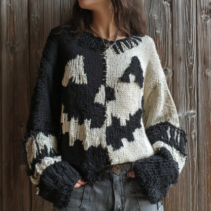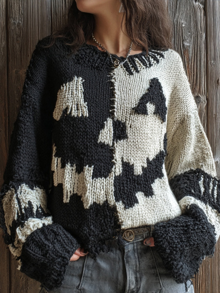 Women's Halloween Pumpkin Face Patchwork Cozy Pullover Knit Sweater