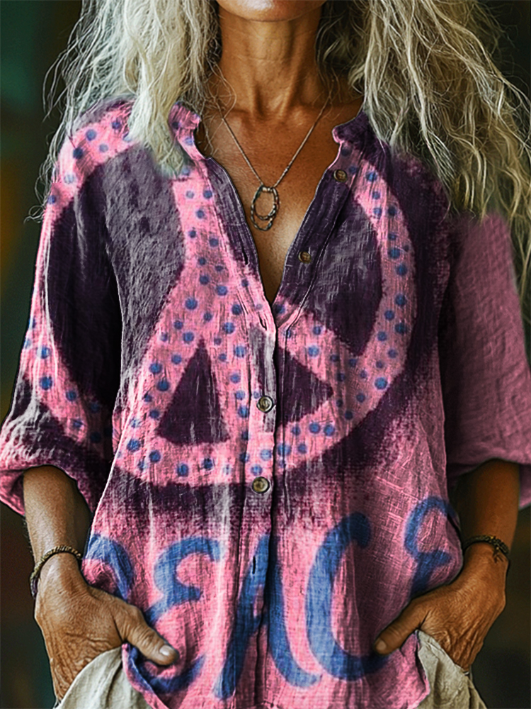 Women's Hippie Peace Art Print Casual Cotton Linen Shirt