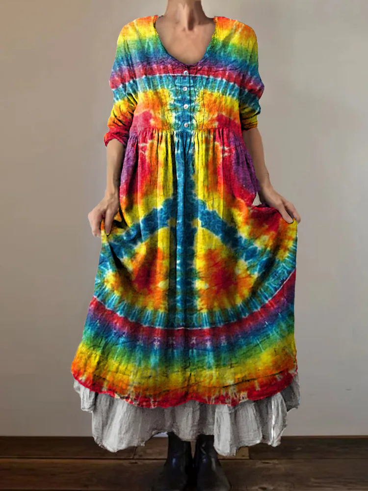 Women's Hippie Tie Dye Art Print V-Neck Button Pocket Cotton Dress