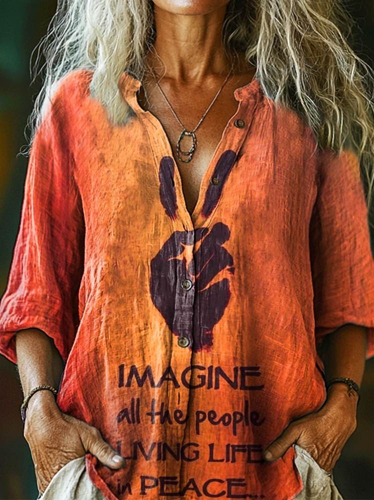 Women's Imagine All The People Living Life In Peace Print Casual Cotton Linen Shirt